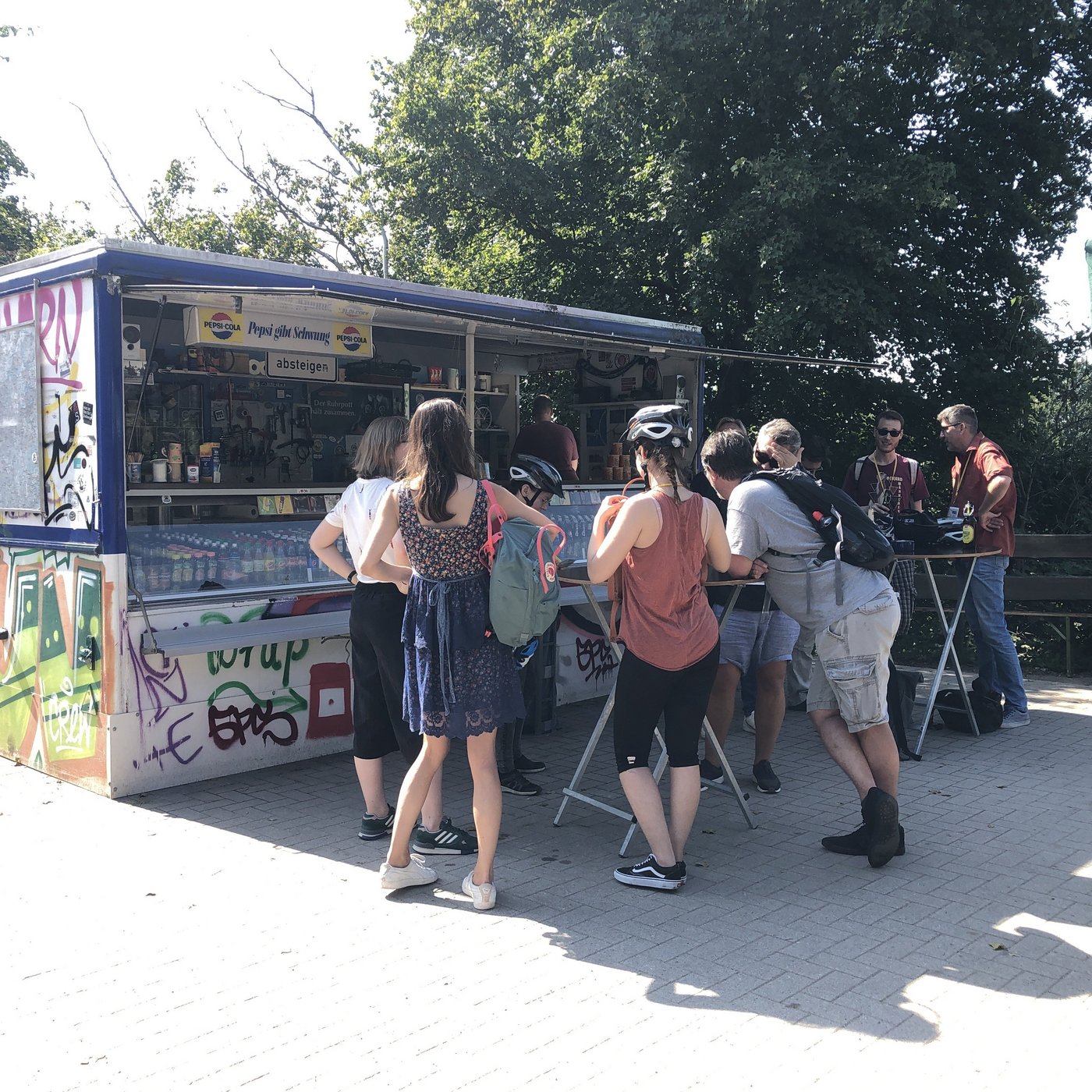 Wohl dem, das Ruhrgebiet per Rad erkundet. Denn allein er hat die Chance, an Holgers Erzbahnbude einzukehren! Circa 20 Minuten nach Fahrtantritt und kurzweiligen 3 Kilometern reiner Radwegstrecke durch vorbei an Industriekultur und viel Grün liegt dieses Kleinod plötzlich vor uns: Gibt es DEN perfekten Ruhrgebietskiosk, so muss er aussehen wie Holgers Erzbahnbude. Neben kaltem Bier (Stauder), gibt es Eis, lecker Kuchen, Frikadellen, und einen glänzend aufgelegten Budenbesitzer. Sonnenstühle laden zum Verweilen ein, was wir jedoch mit leichtem Bedauern ablehnen müssen: Die Straße ruft!